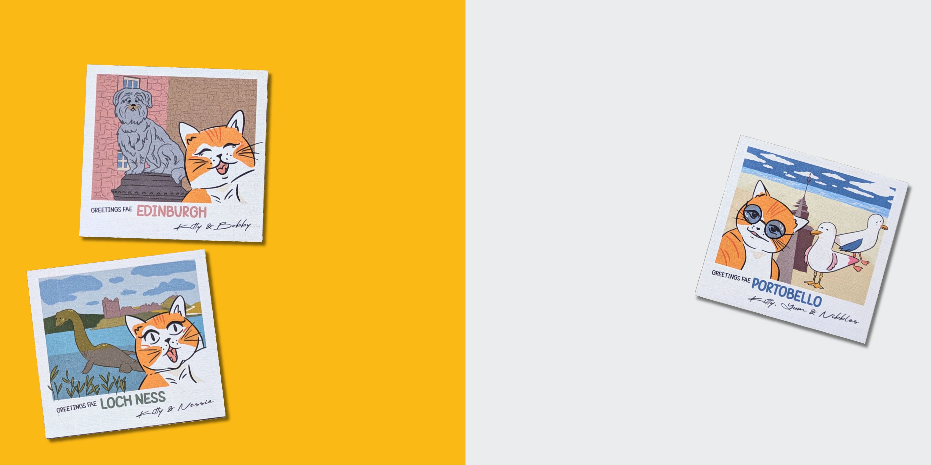 A hilarious collection of instant print-style stickers and magnets featuring an adventurous feline traveler exploring Scotland's most iconic landmarks and whimsical attractions.