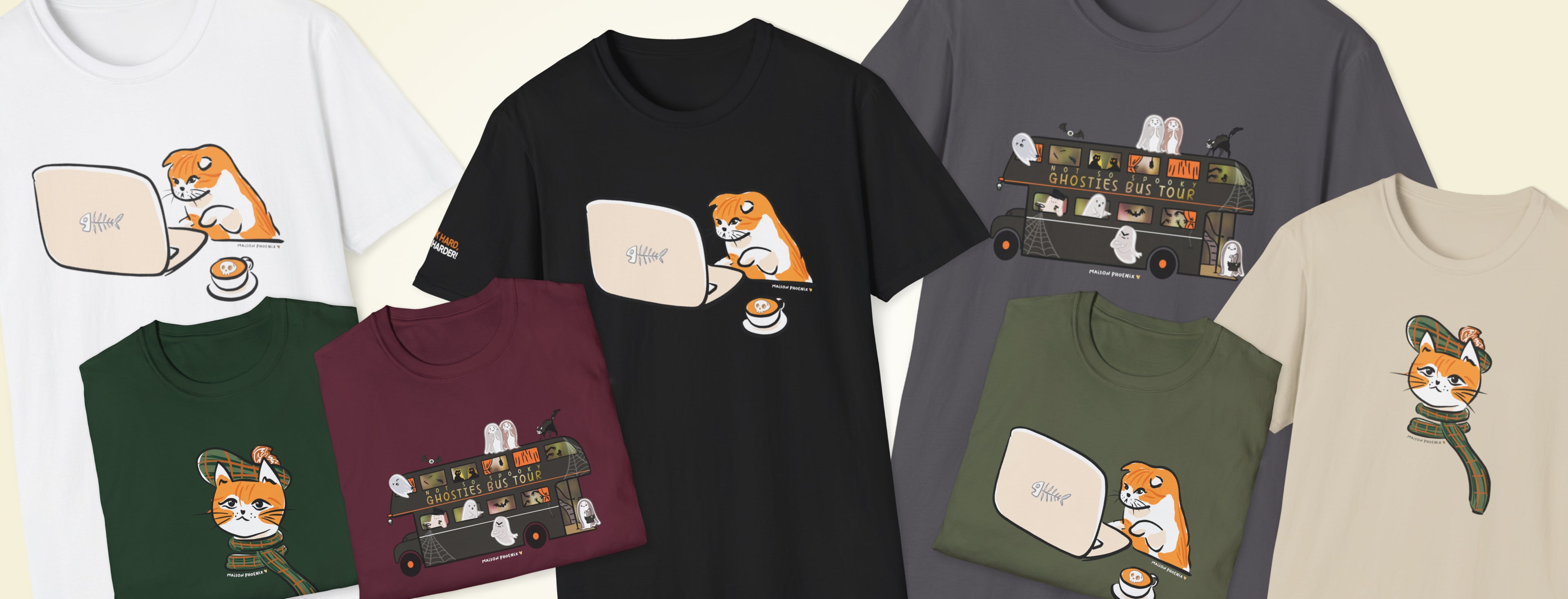 Get ready to fall head over paws! Our latest t-shirt collection is here, blending spectral adventures, Scottish cuteness, and a dash of modern-day feline hustle.