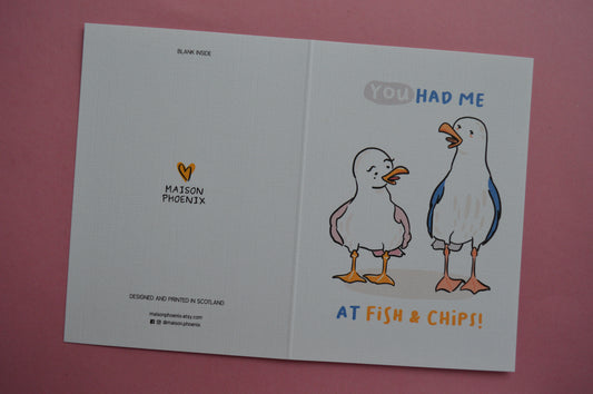 Nibbles & Yum Seagulls Greeting Card (You had me at fish & chips)