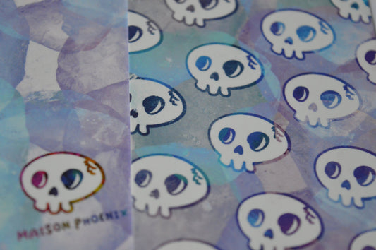 Pop, the blue eyed skull, is gentle, calm, more reserved, observant, and a bit of a worrier. She acts as a calming influence on Pip.