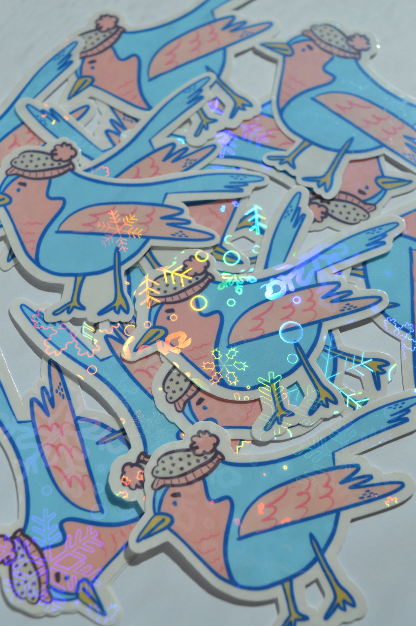 A wintry holographic sticker featuring my original digital illustration of a robin wearing a cosy hat.